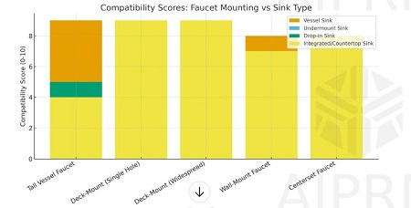 - A compatibility chart is included showing relative scores for common faucet vs sink-type combinations (tall vessel faucets score highest for vessel sinks; undermount sinks pair best with standard deck-mounted faucets). The chart and underlying table are shown so you can compare options at a glance.