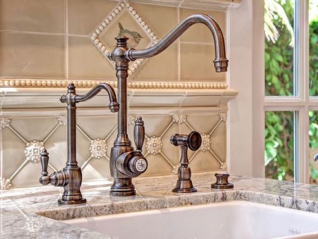- Wall-mounted faucets — Very compatible. They free up space on the deck and work well in places where the countertop is thin or made from a material that is difficult to drill. The spout height above the sink rim and the spout reach are both extremely important.