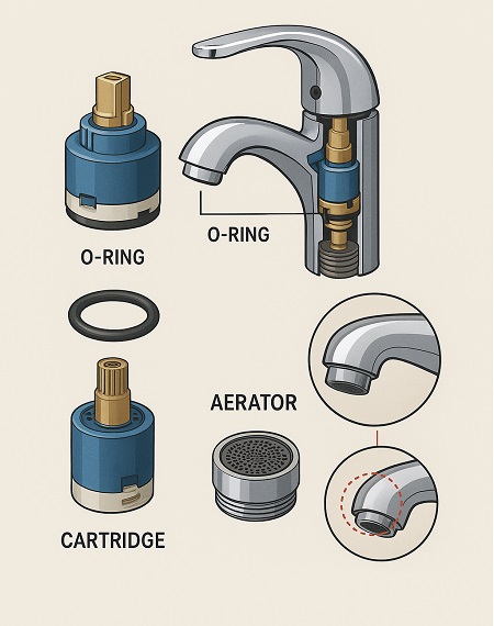 O-rings are rubber seals preventing leaks at the handle, spout base, and connection joints. They are inexpensive yet crucial.